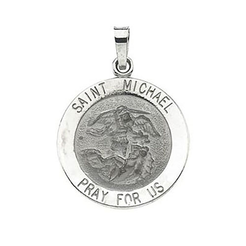 This small round solid 14k white gold St Michael medal is die struck and built to last. 18mm diameter. This item is the size of a dime. Inscription reads: SAINT MICHAEL PRAY FOR US. Weighs 2.29 grams. Please note: weight is approximate, actual weight may vary. Fits up to a 2mm wide chain. Made in USA.