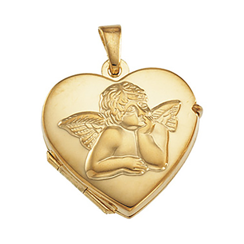 Heart shaped Raphael angel locket is made of polished 14kt yellow gold. Item size: 17.5mm x 18.5mm. Fits up to a 2.5mm wide chain. Weight: 2.32 grams. Please note: weight is approximate, actual weight may vary.
