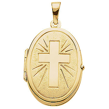 This oval cross locket is made of polished 14kt yellow gold. Length: 7/8in. Weight: 1.81 DWT (2.81 grams) Please note: weight is approximate, actual weight may vary.