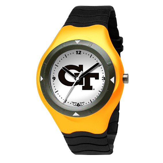 Georgia Tech University prospect watch is youth size and water resistant. The watch case is 1 5/8 inches wide. The dial diameter is 1 inch. The watch case is made of ABS plastic resin with a stainless steel screw back. The coordinating colorful strap is made from polyurethane rubber with a stainless steel buckle. Acrylic crystal face. Team logo is shown boldly in the center of the watch. The Prospect model features a precision Miyota quartz movement (377 battery), and has hour, minute and second hands. Hanging flat blister packaging. Two year limited warranty.