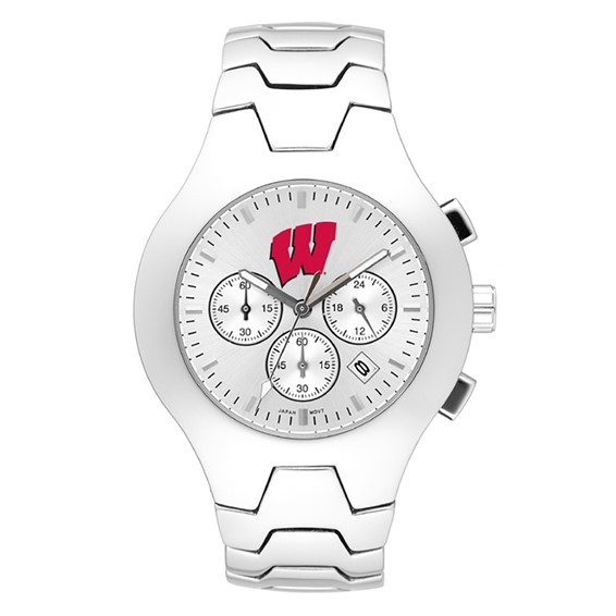 The men's University of Wisconsin hall of fame watch has a 41mm stainless steel case. Stainless steel oval-shaped chronograph pushers. Red W logo is shown above the subdials. The Hall of Fame™ model features a Citizen® chronograph movement with date window and has Swiss luminous diamond cut hands. Solid stainless steel polished bracelet with butterfly clasp. The mineral glass lens has a non-reflective coating. Water-resistant to 10 ATM. Showcased in an aluminum gift box. Two year limited warranty.