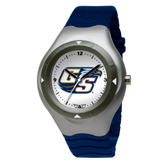 Georgia Southern University prospect big kid watch has a blue strap made from polyurethane rubber with a stainless steel buckle. The watch case is made of ABS plastic resin with a stainless steel screw back. The watch case is 1 5/8 inches wide. The dial diameter is 1 inch. Acrylic crystal face. School logo is shown boldly in the center of the watch. The Prospect model features a precision Miyota quartz movement (377 battery), and has hour, minute and second hands. Hanging flat blister packaging. Two year limited warranty.