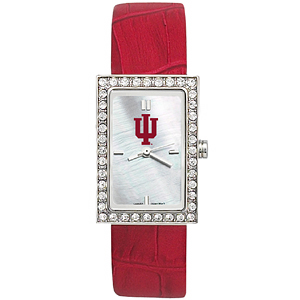 She'll love wearing the red leather Indiana University starlette watch. This dazzling watch has the university logo featured in vibrant red on a genuine mother of pearl dial. Adorned with 40 cubic zirconias, the case is powered by a Citizen® quartz movement. Matching pastel leather strap in crocodile embossed pattern. Packaged in designer LA LA LA box. Two year limited warranty. Team the Starlette Watch up with the I Heart Pendant and Earrings for a fabulous team trio!
