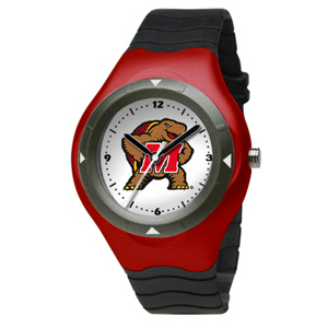 Show your team colors with the University of Maryland prospect watch. This is a youth size water resistant watch. The watch case is 1 5/8 inches wide. The dial diameter is 1 inch. The watch case is made of ABS plastic resin with a stainless steel screw back. The coordinating colorful strap is made from polyurethane rubber with a stainless steel buckle. Acrylic crystal face. Team logo is shown boldly in the center of the watch. The Prospect model features a precision Miyota quartz movement (377 battery), and has hour, minute and second hands. Hanging flat blister packaging. Two year limited warranty.