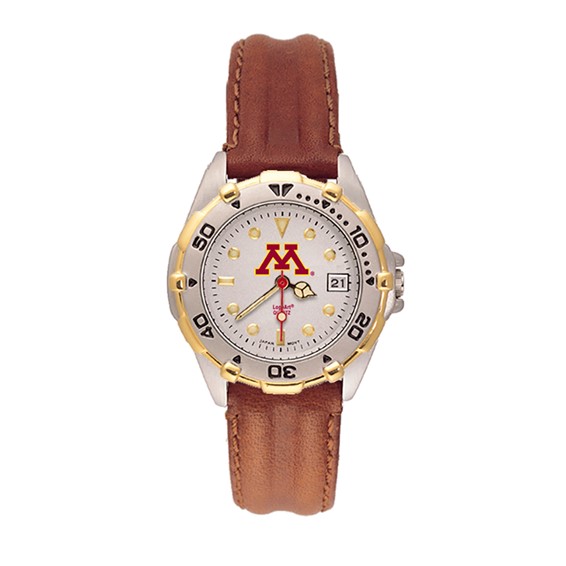 This ladies' University of Minnesota all star watch features a brushed chrome finish case with a rotating two-tone bezel and matching brown leather bracelet. The All-Star features a precision Miyota quartz movement, distinguished dial face, with the team logo on the top half and team name on lower half of dial, date window, raised luminous hour, minute and second hands, and the crystal is mineral glass. Water resistant. Packaged in an attractive silver tin. Two year limited warranty.