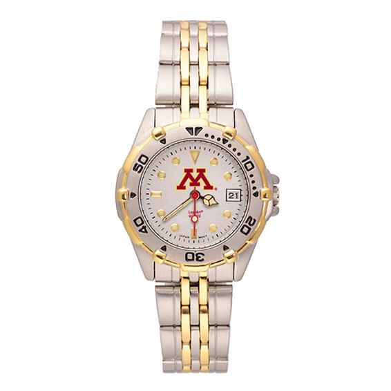 Minnesota Gophers ladies' All Star watch has brushed chrome finish case with a rotating two-tone bezel and matching two tone stainless steel bracelet. The All-Star features a precision Miyota® quartz movement, distinguished dial face, with the team logo on the top half and team name on lower half of dial, date window, raised luminous hour, minute and second hands, and the crystal is mineral glass. Water resistant. Packaged in an attractive silver tin. Two year limited warranty.