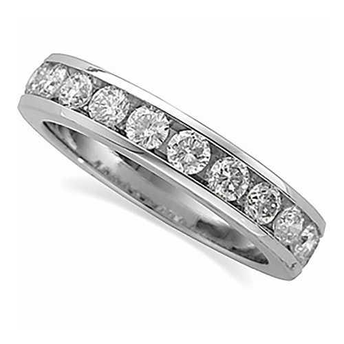 This platinum 1 1/8 carat diamond wedding band features 11 channel set round diamonds. Each full-cut diamond is 3.0mm in diameter, SI2 clarity, G-H color. All diamonds are hand selected to match for color and clarity. Total carat weight approximately 1 CT. Hallmark PLAT on the interior. Flat edges. Size 7 band weighs approximately 8.58 grams.