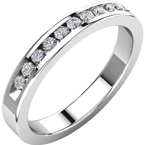 Polished platinum 950 wedding band. This diamond wedding band features 11 channel set round diamonds. Each full-cut diamond is 1.8mm in diameter, SI2 clarity, G-H color. All diamonds are hand selected to match for color and clarity. Total carat weight approximately 1/4 CT. Hallmark PLAT on the interior. Flat edges. Size 7 band weighs approximately 6.50 grams.