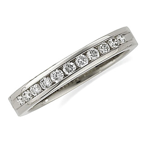 Platinum 1/3 carat diamond wedding band features 11 channel set round diamonds. Each full-cut diamond is 2.0mm in diameter, SI2 clarity, G-H color. All diamonds are hand selected to match for color and clarity. Total carat weight approximately 1/3 CT. Hallmark PLAT on the interior. Flat edges. Size 7 band weighs approximately 6.50 grams. Dimensions: Width at the top: 3.18mm, width in the middle: 3.14mm, width at the bottom: 3.24mm.