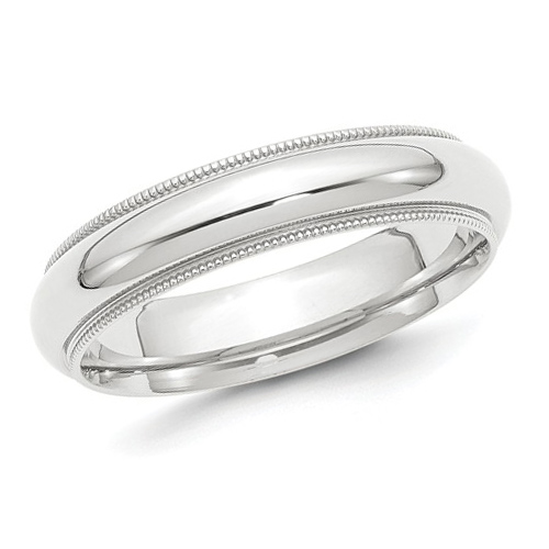This 5mm platinum wedding band has a milgrain edge and domed center. Comfort fit. Available in 5-12, whole finger sizes only. Made of platinum 950. Hallmark PLAT on the interior. Size 7 band weighs approximately 8.65 grams. Made in the USA.
