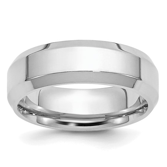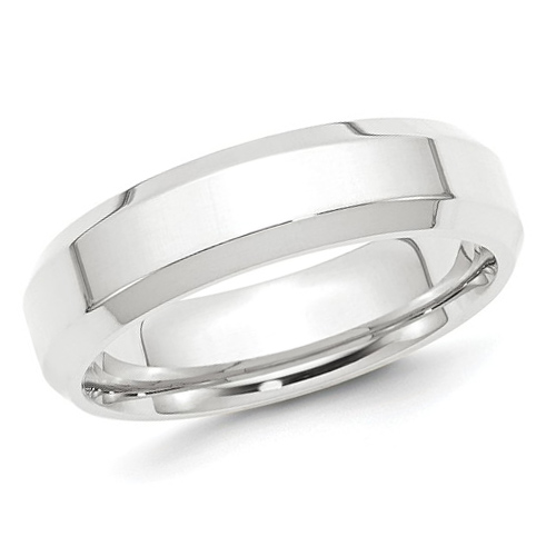 This comfort fit platinum 950 wedding band has beveled edges and a polished finish. Ring width: 6mm. Thickness: 2mm. Available in 6-12, whole finger sizes only. Hallmark PLAT on the interior. Size 10 band weighs approximately 15.7 grams. Made in the USA.