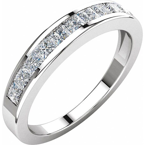 This platinum 3/4 ct tw diamond wedding band features 11 channel-set princess cut diamonds. Each princess diamond is 2.20mm, width SI2 clarity, G-H color. All diamonds are hand selected to match for color and clarity. Total carat weight approximately 3/4 CT. Ring dimensions: The width at the top is 3.66 mm, and at the bottom 2.44 mm. The thickness at the top is 2.86mm, and at the bottom 1.55mm.Hallmark PLAT on the interior. Flat edges. Size 7 band weighs approximately 3.52 DWT (5.48 grams) Available in whole and half finger sizes only, 5-8.
