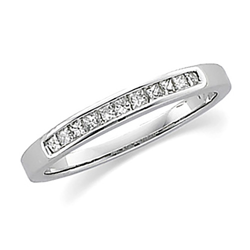 1/4CT diamond platinum 950 wedding band with polished finish. This diamond wedding band features 11 channel-set princess cut diamonds. Each princess diamond is 1.5mm, SI2 clarity, G-H color. All diamonds are hand selected to match for color and clarity. Total carat weight approximately 1/4 CT. Hallmark PLAT on the interior. Flat edges.The shank of this band measures 3.25mm at its widest point and tapers to 1.75mm. A size 7 band weighs approximately 4.04 grams. Available in whole finger sizes only, 5-8.