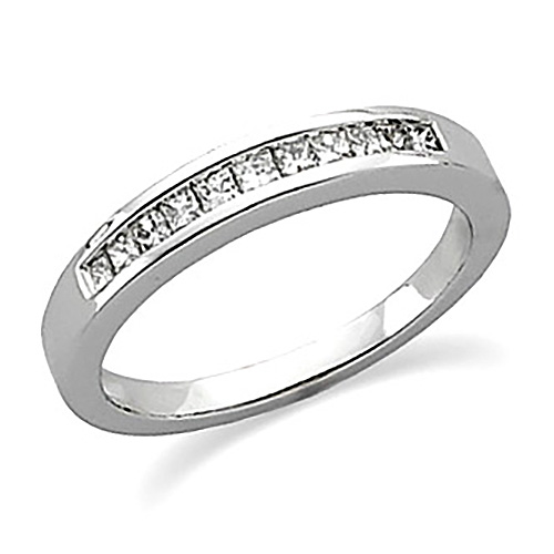 1/3CT diamond platinum 950 wedding band with polished finish. This diamond wedding band features 11 channel-set princess cut diamonds. Each princess diamond is 1.7mm, SI2 clarity, G-H color. All diamonds are hand selected to match for color and clarity. Total carat weight approximately 1/3 CT.Hallmark PLAT on the interior. Flat edges. Size 7 band weighs approximately 4.50 grams. Available in whole finger sizes only, 5-8. Band thickness: top 3.5mm, side 3mm, bottom 2mm.