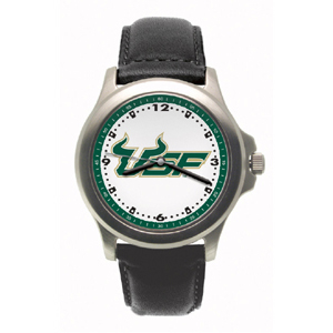Clearance! All sales final. Go Bulls! Show your pride in the University of South Florida. The Rookie watch for kids features a brushed finished case and has a bold logo on a large dial and a precision Miyota quartz movement. It has a coordinating colored dial ring and printed hour and minute marks. The Rookie comes with a padded leather strap, and is available as one unisex size. Water resistant. Packaged in an attractive tin. Two year limited warranty.