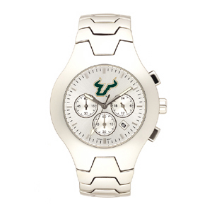The men's University of South Florida hall of fame watch has a polished stainless steel case with stainless steel oval-shaped chronograph pushers. Team logo is shown above the subdials. The Hall of Fame™ model features a Citizen® chronograph movement with date window and has Swiss luminous diamond cut hands. Solid stainless steel polished bracelet with butterfly clasp. The mineral glass lens has a non-reflective coating. Water-resistant to 10 ATM. Showcased in an aluminum gift box. Two year limited warranty.