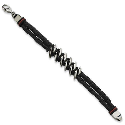 Black and rust colored rubber accents. Black leather bracelet is 8 1/2 inches in length. Fancy lobster clasp. This bracelet is composed of grade 316 stainless steel, known for its superior corrosion resistance. 316 steel is commonly used in stainless steel jewelry. Insist on 316 stainless steel. 316 steel is also known as marine grade stainless steel, for its high resistance to chloride corrosion. Stainless steel will not oxidize [rust] nor turn black. Imported.
