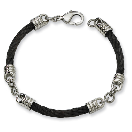 This men's 9in stainless steel bracelet has black ion plated cable and a fancy lobster clasp. This bracelet is composed of grade 316 stainless steel. Import.