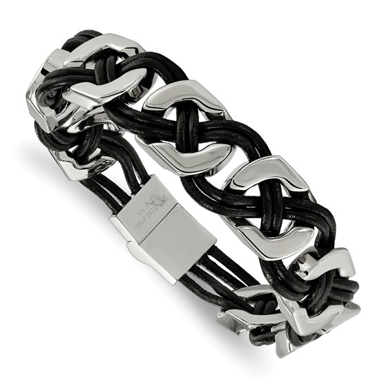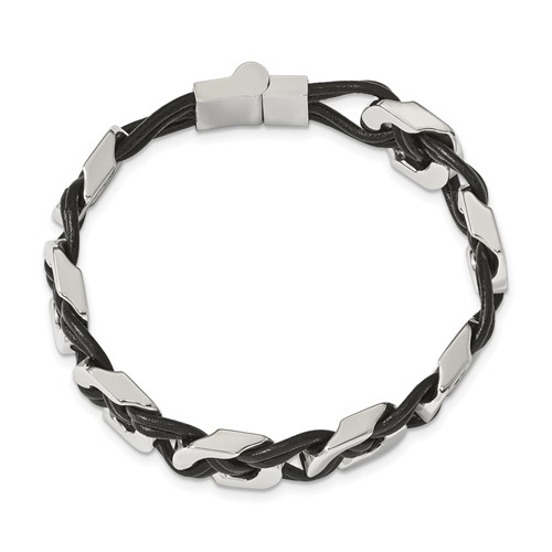 Black leather bracelet with steel links. This bracelet is 8 inches in length. Large fancy lobster clasp. This bracelet is composed of grade 316 stainless steel, known for its superior corrosion resistance. 316 steel is commonly used in stainless steel jewelry. Insist on 316 stainless steel. 316 stainless steel is also known as marine grade stainless steel, for its high resistance to chloride corrosion. Stainless steel will not oxidize [rust] nor turn black. Imported.