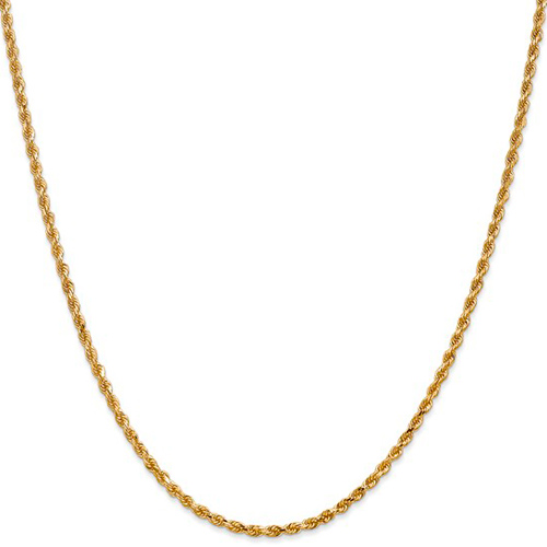 This solid 14k yellow gold 30in rope chain is diamond-cut and handmade. Lobster clasp. Width: 2.50mm. Weighs 13.5 grams. Please note: weight is approximate, actual weight may vary. Made in Peru. Ships from USA.