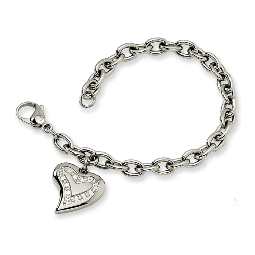 Stainless steel heart charm bracelet features cubic zirconia accents. It has a lobster clasp. Bracelet length: 7.5in. This item is composed of grade 316 stainless steel. Stainless steel will not oxidize [rust] nor turn black. Imported.