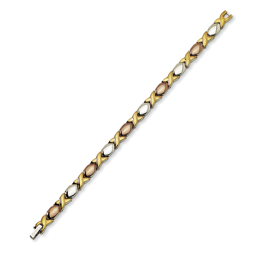 Brown and yellow-plated bracelet is 7 1/2in. This item is composed of grade 316 stainless steel, known for its superior corrosion resistance. 316 steel is commonly used in stainless steel jewelry. Insist on 316 stainless steel. 316 steel is also known as marine grade stainless steel, for its high resistance to chloride corrosion. Stainless steel will not oxidize [rust] nor turn black. Imported.