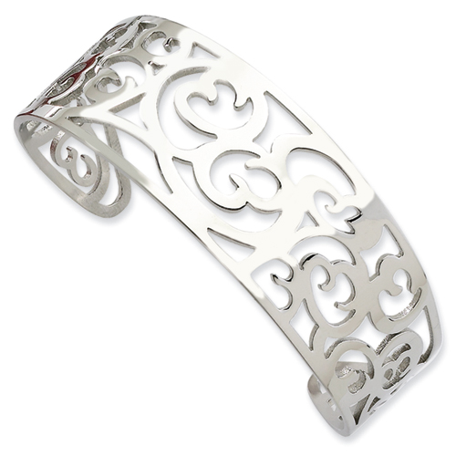 This ladies' cut-out fancy cuff bracelet is made of stainless steel. Bracelet length: 7in, width: 1in. This item is composed of grade 316 stainless steel. Stainless steel will not oxidize [rust] nor turn black. Imported.