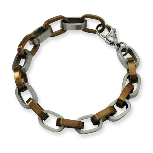 This men's chocolate brown and gray stainless steel bracelet has oversize links and a large fancy lobster clasp. Brushed finish. Bracelet length: 8.5 inches. Link width: 9mm. This item is composed of grade 316 stainless steel. Stainless steel will not oxidize [rust] nor turn black. Imported.