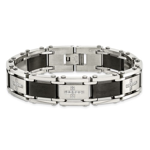 This men's stainless steel bracelet features crosses with 1/4 carat total weight diamond accents. Length: 8 3/4in. Fold-over clasp. Import.