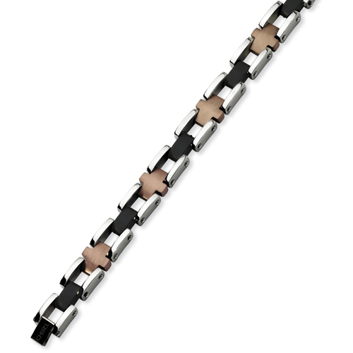 This men's stainless steel bracelet has alternating chocolate brown and black links. Bracelet length: 8.75 inches. Link width: .5in. Fold-over clasp. This item is composed of grade 316 stainless steel. Stainless steel will not oxidize [rust] nor turn black. Imported.
