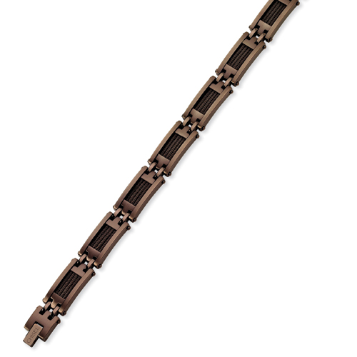 This stainless steel chocolate ion-plated bracelet has a brushed and polished finish with inset wires. Length: 9in. Fold-over clasp.