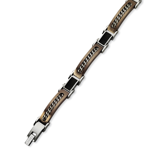 Chocolate-plated stainless steel bracelet. Black carbon figer. Brushed and polished finish. Link width: 3/8in. Bracelet length: 8in. This item is composed of grade 316 stainless steel, known for its superior corrosion resistance. 316 steel is commonly used in stainless steel jewelry. Insist on 316 stainless steel. 316 steel is also known as marine grade stainless steel, for its high resistance to chloride corrosion. Stainless steel will not oxidize [rust] nor turn black. Imported.
