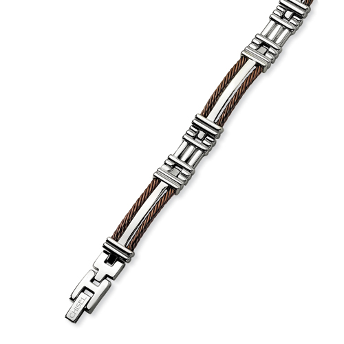 Stainless steel bracelet has brown ion-plated cables and polished links. Item length: 8 1/2in. Link width: 1/2in. This item is composed of grade 316 stainless steel. Imported. Available while supplies last.