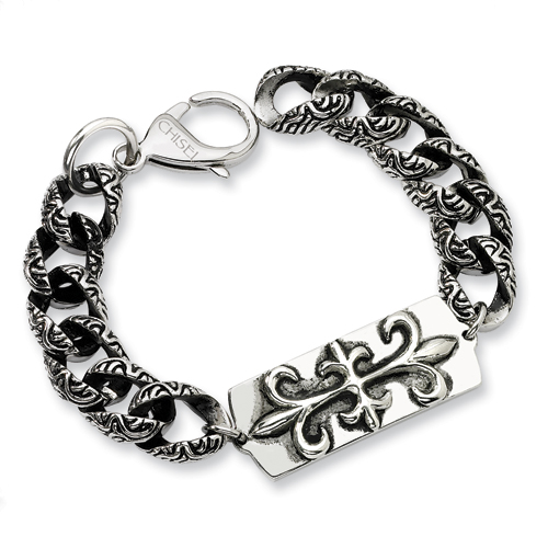 This men's stainless steel fleur-de-lis bracelet has antiqued textured links. Fancy lobster clasp. Bracelet length: 8.5 inches. This item is composed of grade 316 stainless steel, known for its superior corrosion resistance. 316 steel is commonly used in stainless steel jewelry. Insist on 316 stainless steel. 316 steel is also known as marine grade stainless steel, for its high resistance to chloride corrosion. Stainless steel will not oxidize [rust] nor turn black. Imported.