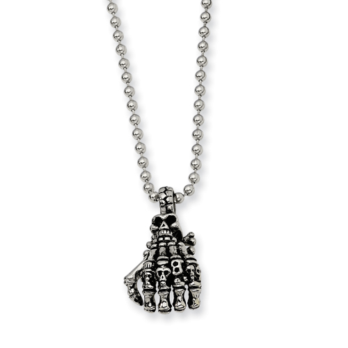Stainless steel skeleton hand pendant dangles from a 22in steel bead chain. Fancy lobster clasp. Pendant size: 32mm x 19mm. Import.