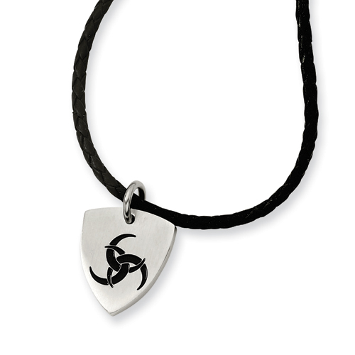 Stainless steel enameled necklace has a fancy lobster clasp. 18in black leather cord. This pendant is composed of grade 316 stainless steel. Imported. Clearance! All sales final while supplies last.