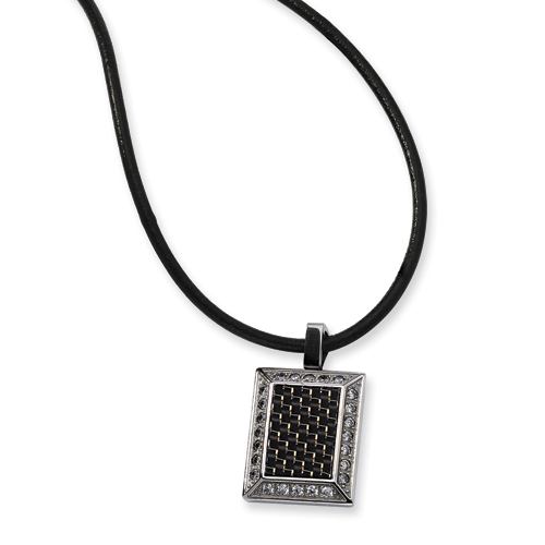 Stainless steel rectangular pendant features gold and black carbon fiber and cubic zirconia accents. The pendant from a 22in black leather cord. Imported. Clearance, available while supplies last.