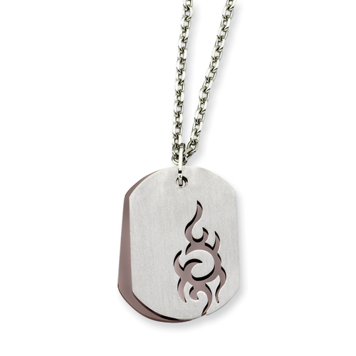 This men's dog tag necklace has a chocolate brown piece and a stainless steel piece with cut-out design. Dog tag size: 1 3/4in x 1in. Cable chain length: 22in. Iitem is composed of grade 316 stainless steel, known for its superior corrosion resistance. 316 steel is commonly used in stainless steel jewelry. Insist on 316 stainless steel. 316 steel is also known as marine grade stainless steel, for its high resistance to chloride corrosion. Stainless steel will not oxidize [rust] nor turn black. Imported.