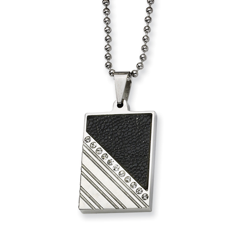 Stainless steel rectangular pendant features stingray patterened leather and cubic zirconia accents. Ball chain length: 24in. Fancy lobster clasp. This item is composed of grade 316 stainless steel. Imported. Clearance, available while supplies last.