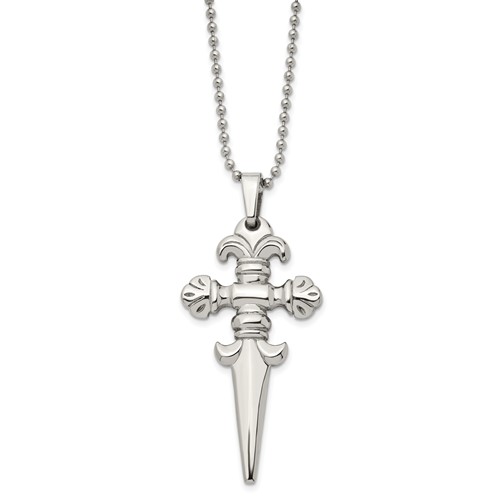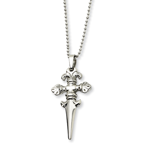 This large fancy dagger necklace is made of stainless steel. Pendant length: 2 3/4in. Bead chain length: 24in. This item is composed of grade 316 stainless steel, known for its superior corrosion resistance. 316 steel is commonly used in stainless steel jewelry. Insist on 316 stainless steel. 316 steel is also known as marine grade stainless steel, for its high resistance to chloride corrosion. Stainless steel will not oxidize [rust] nor turn black. Imported.