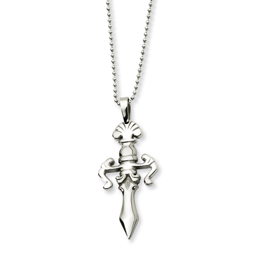 This large ornate dagger necklace is made of polished stainless steel. Pendant length: 2 1/2in. Bead chain length: 24in. This item is composed of grade 316 stainless steel, known for its superior corrosion resistance. 316 steel is commonly used in stainless steel jewelry. Insist on 316 stainless steel. 316 steel is also known as marine grade stainless steel, for its high resistance to chloride corrosion. Stainless steel will not oxidize [rust] nor turn black. Imported.