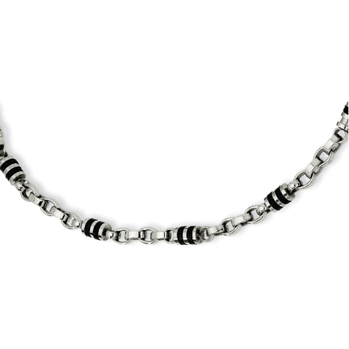 Stainless steel necklace has barrel shaped links with black rubber accents. Length: 22in. This item is composed of grade 316 stainless steel, known for its superior corrosion resistance. 316 steel is commonly used in stainless steel jewelry. Insist on 316 stainless steel. 316 steel is also known as marine grade stainless steel, for its high resistance to chloride corrosion. Stainless steel will not oxidize [rust] nor turn black. Imported.