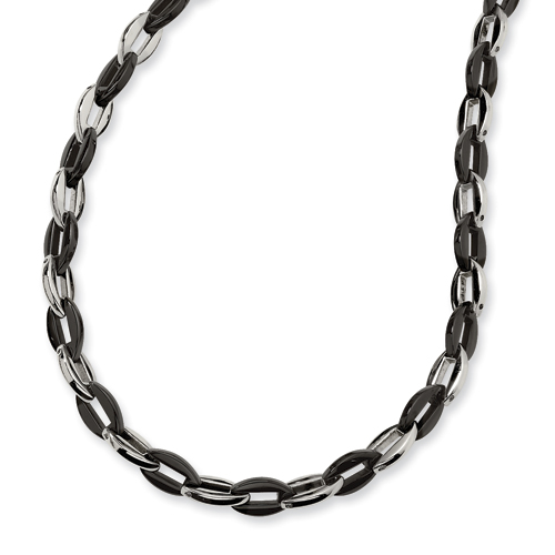 This long stainless steel necklace has gray and black-plated oval links. Length: 24in. Link width: 8mm. Fancy lobster clasp. This item is composed of grade 316 stainless steel, known for its superior corrosion resistance. 316 steel is commonly used in stainless steel jewelry. Insist on 316 stainless steel. 316 steel is also known as marine grade stainless steel, for its high resistance to chloride corrosion. Stainless steel will not oxidize [rust] nor turn black. Imported.