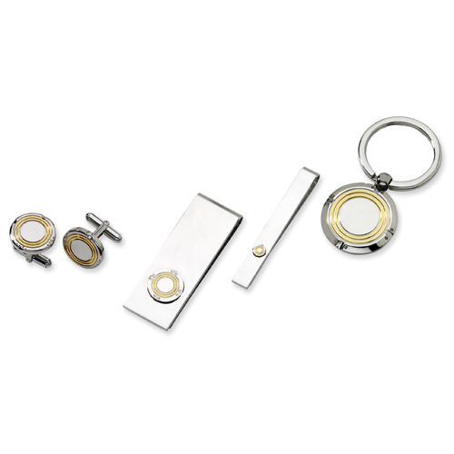 This money clip, tie clip, cufflinks and key chain gift set has yellow ion-plated round accents. These items are composed of grade 316 stainless steel, known for its superior corrosion resistance. 316 steel is commonly used in stainless steel jewelry. Insist on 316 stainless steel. 316 steel is also known as marine grade stainless steel, for its high resistance to chloride corrosion. Stainless steel will not oxidize [rust] nor turn black. Imported.