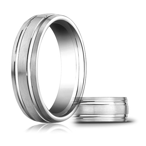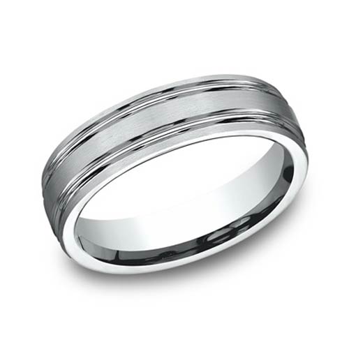 Solid 10k white gold wedding band has a satin finish with two polished ridges. Die struck and comfort fit. Width: 6mm. Thickness: 1.9mm. Made in USA.