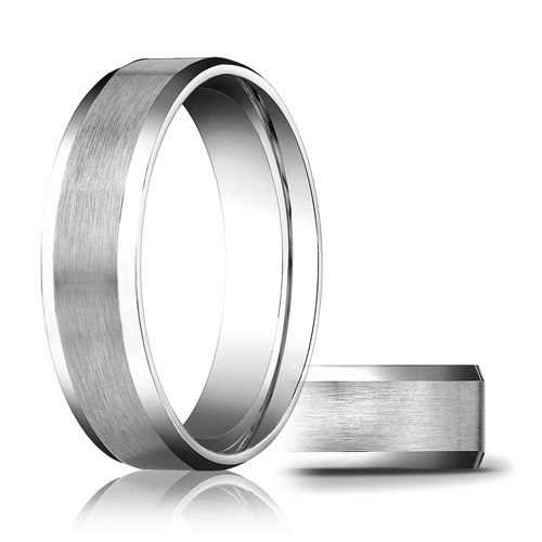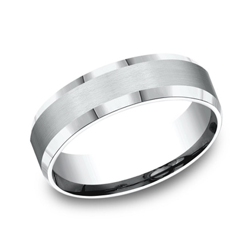 10k white gold wedding band has a satin finish and polished beveled edges. Die struck and comfort fit. Width: 6mm. This ring is made from 100% recycled gold, sourced directly from suppliers with Scientific Certification Services recycled content certification. Made in USA.