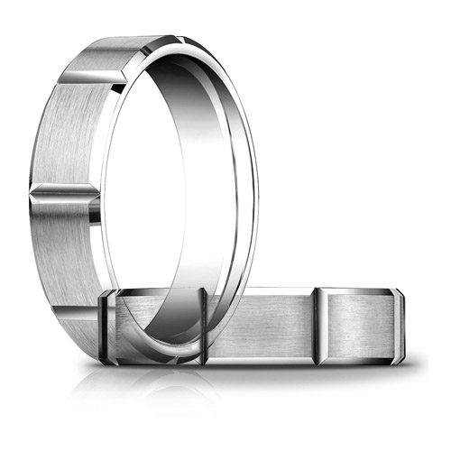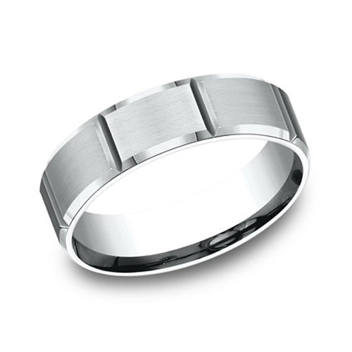 10k white gold men's wedding band has a satin finish with panels. Polished beveled edges. Width: 6mm. Die struck and comfort fit. Made in USA.