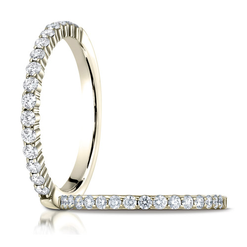 This slender 2mm 14kt yellow gold shared prong diamond band features 16 round ideal cut diamonds. Total approximate carat weight is .32 ct. Diamond color G, clarity SI1. Solid 14kt yellow gold. Made in USA.