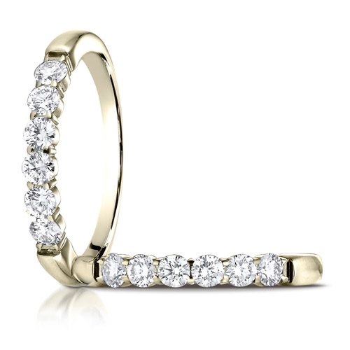 14kt yellow gold shared prong diamond band features six round ideal cut diamonds. Total approximate carat weight is .48 ct. Diamond color G, clarity SI1. Standard fit. Width: 3.0mm. Thickness: 1.8mm. Made in USA.
