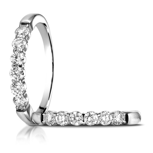 14kt white gold shared prong diamond band features six round ideal cut diamonds. Total approximate carat weight is .48 ct. Diamond color G, clarity SI1. Width: 3.0mm. Thickness: 1.8mm. Made in USA.